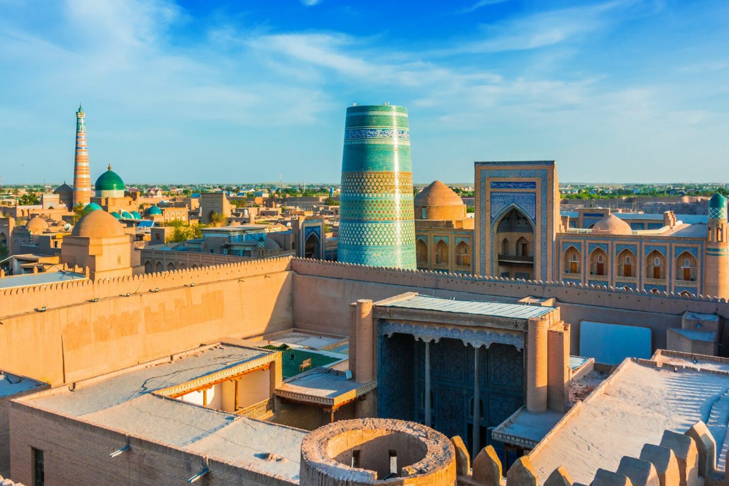 08:30 Arrive in Urgench and transfer to Khiva (34 km). Arrive in Khiva. Leave your luggage at the hotel (check in from 14:00) and start your walking sightseeing tour in ancient Khiva. Explore the walled inner town of the city of Khiva — Itchan Kala. Visit Mukhammad Aminkhan Madrasah, Mukhammad Rahimkhan Madrasah, Kalta-Minor, Kunya-Ark, Juma Mosque, Tash-Khovli Palace, Minaret of Islam-Khoja, Pakhlavan Makhmud Mausoleum. Free time. Overnight at the hotel.